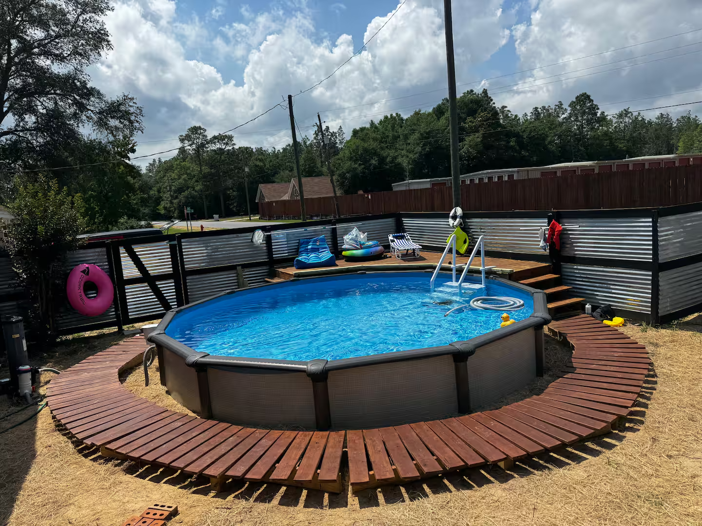 The beautiful private FULLY FENCED-backyard includes a bbq grill, fire pit, semi in ground pool, trampoline and awesome tree swing (that I put in myself-Give it a try it’s amazing!)