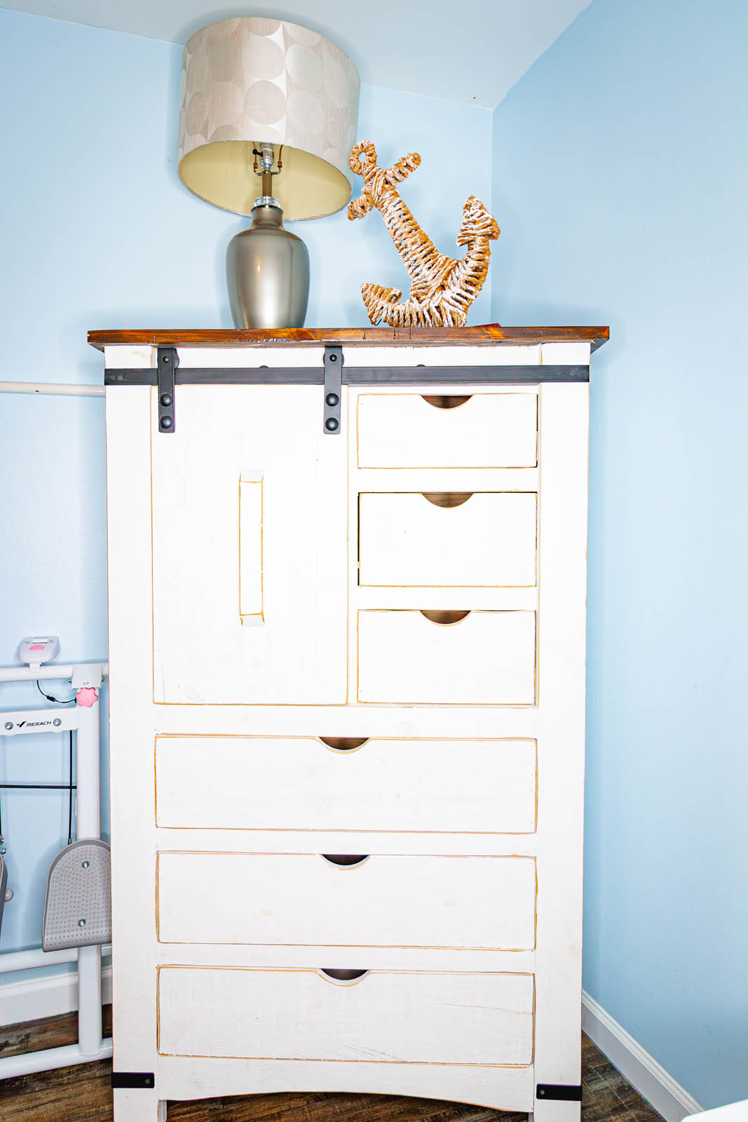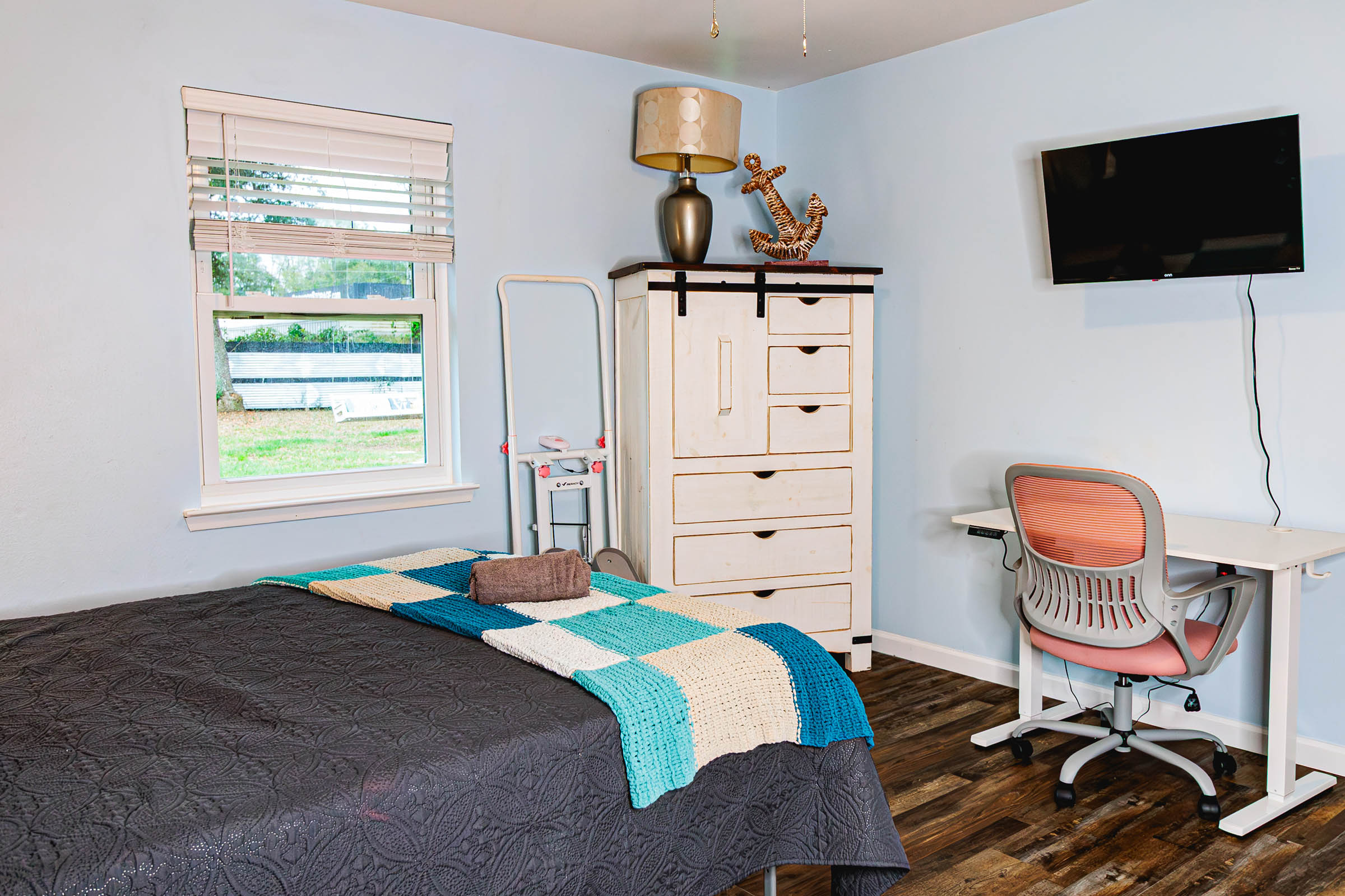 Master bedroom includes a queen bed, adjustable height desk, office chair and manual elliptical machine.